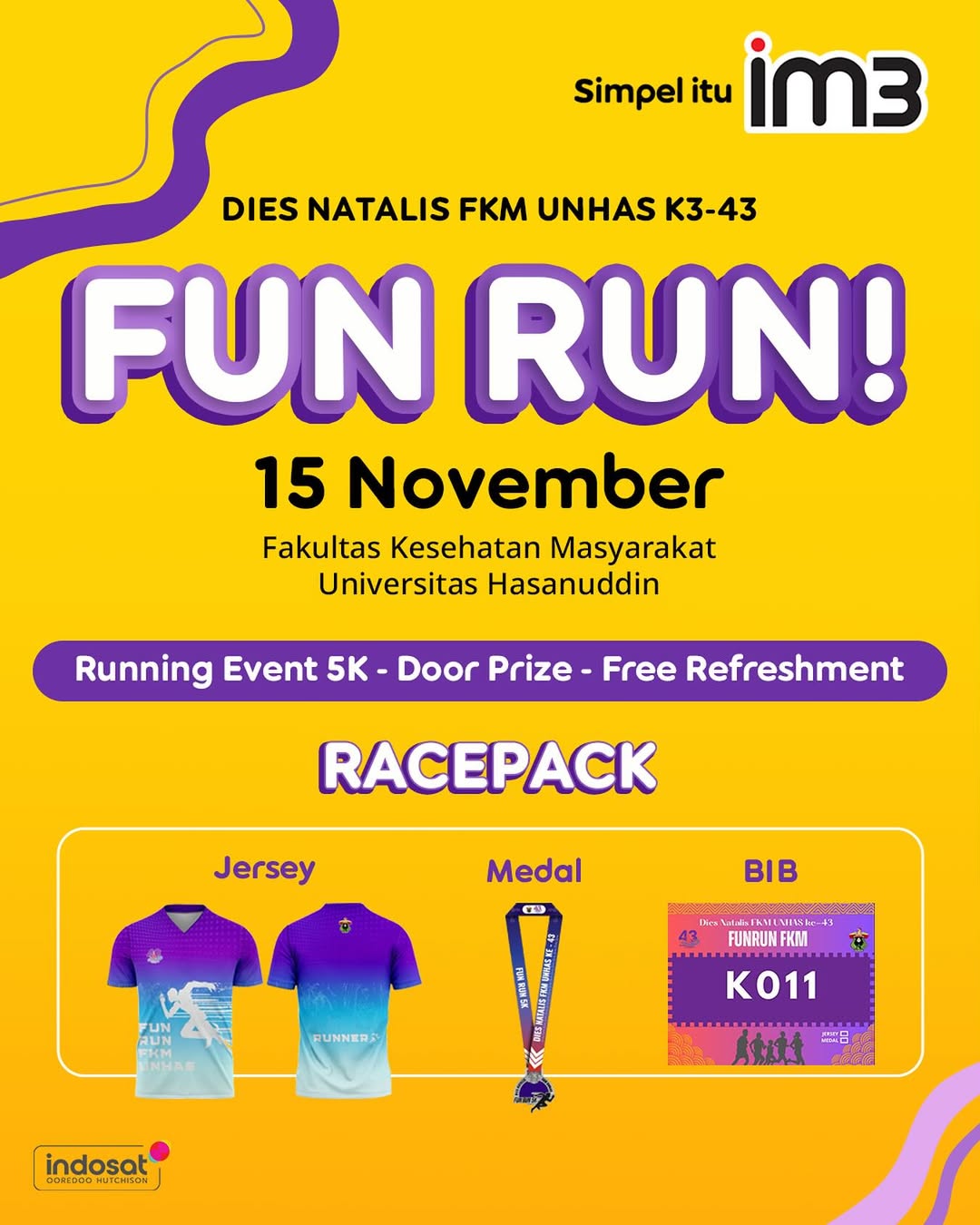 Limabelas Indonesia, Makassar, 10 November 2025 – Dalam rangka perayaan Dies Natalis ke-43, Fakultas Kesehatan Masyarakat (FKM) Universitas Hasanuddin (Unhas) akan menggelar acara lari santai bertajuk “Fun Run 5K” yang dilaksanakan pada Sabtu, 15 November 2025. Kegiatan ini diselenggarakan bekerja sama dengan Indosat Ooredoo Hutchison (IOH) melalui brand IM3, sebagai wujud komitmen mempromosikan gaya hidup sehat di tengah masyarakat.