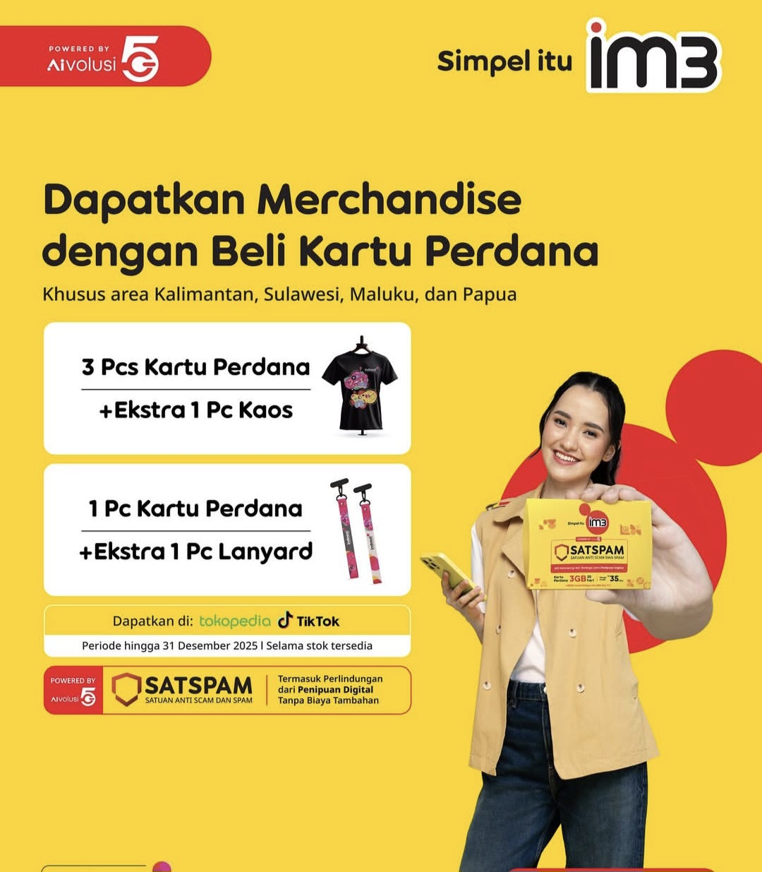 Dalam program tersebut, pelanggan yang membeli 3 pcs kartu perdana IM3 berhak mendapatkan 1 pcs kaos eksklusif. Sementara itu, untuk pembelian 1 pcs kartu perdana, pelanggan akan memperoleh 1 pcs lanyard. Penawaran ini berlaku untuk wilayah Kalimantan, Sulawesi, Maluku, dan Papua, dan dapat dinikmati hingga 31 Desember 2025.