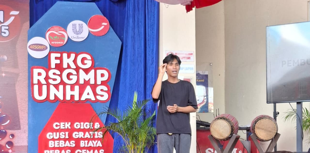 Limabelas Indonesia, Makassar – Di antara deretan tamu undangan yang terdiri dari pejabat, dokter gigi terkemuka, wartawan, serta ratusan masyarakat umum, sosok Junaidi (21) tampak mencuri perhatian. Mahasiswa semester 7 Fakultas Matematika dan Ilmu Pengetahuan Alam (FMIPA) Universitas Hasanuddin (Unhas) itu berdiri tegak di samping podium utama, memainkan peran yang sangat penting di tengah kemeriahan acara.