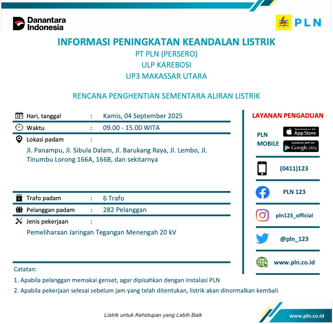 Bagi pelanggan yang memerlukan informasi lebih lanjut terkait pemeliharaan jaringan listrik, dapat menghubungi PLN Call Center 123 atau melalui aplikasi PLN Mobile yang dapat diunduh di perangkat smartphone.
