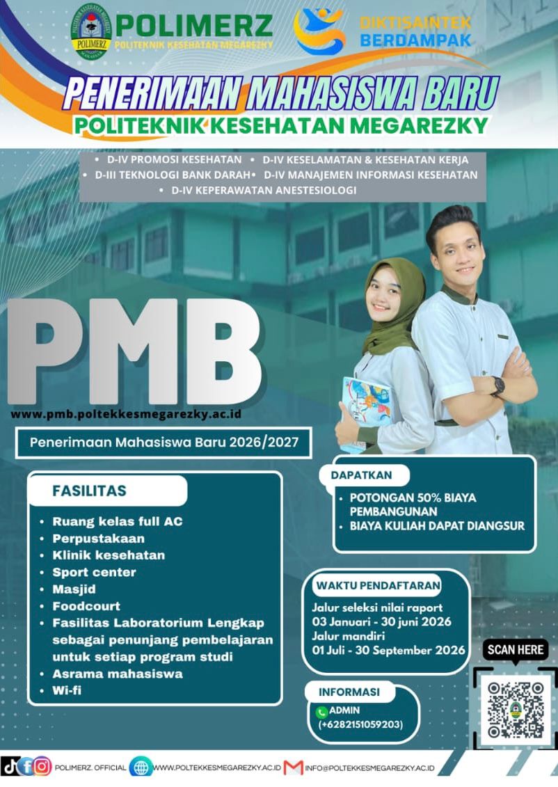 Limabelas Indonesia, Makassar — Politeknik Kesehatan Megarezky atau yang lebih dikenal dengan Polimerz kembali membuka penerimaan mahasiswa baru untuk Tahun Akademik 2026/2027. Pendaftaran dibuka untuk sejumlah program studi unggulan di bidang kesehatan.