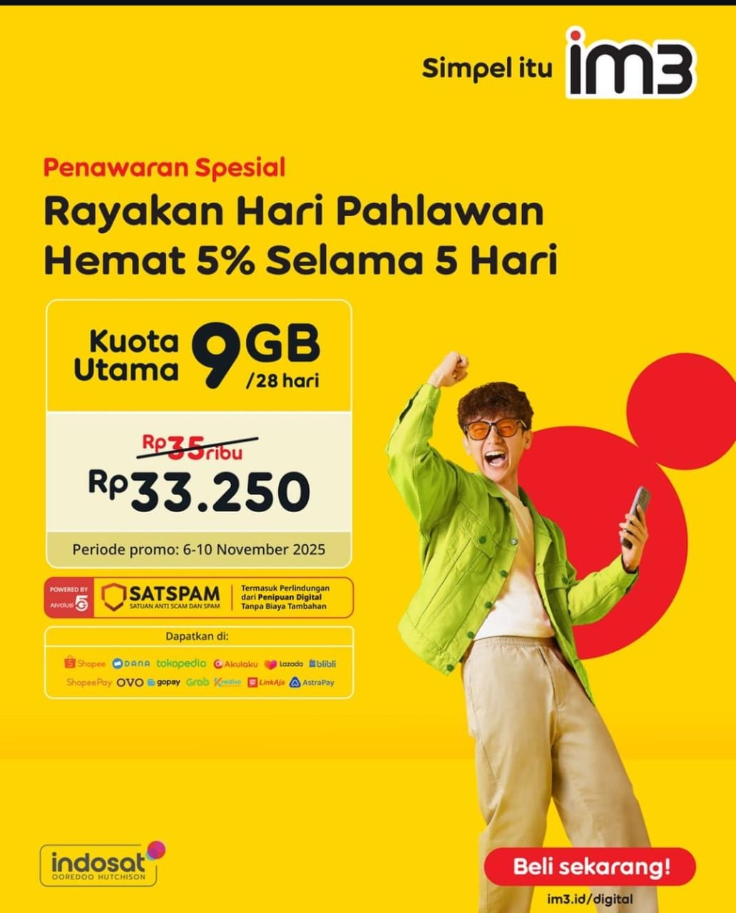 Limabelas Indonesia, Makassar, 10 November 2025 – Merayakan Hari Pahlawan yang jatuh pada 10 November 2025, Indosat Ooredoo Hutchison (IOH) melalui brand IM3 memberikan penawaran spesial berupa diskon hemat hingga 5% selama lima hari penuh. Penawaran ini ditujukan untuk paket data 9 GB yang memiliki masa berlaku 28 hari, kini hanya dibanderol Rp33.250 dari harga normal Rp35.000.